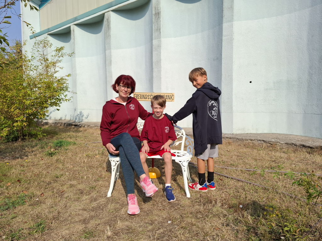 Unsere Sonderpädagogin Frau Schilling hatte die Idee, eine „Freundschaftsbank“ anzuschaffen. In vielen Ländern gibt es sie bereits auf den Schulhöfen. Sie soll dabei helfen, Kinder zusammenzubringen. Sollte ein Kind vielleicht traurig oder allein sein, so kann es sich auf die Bank setzen. Die anderen Kinder werden so auf dieses Kind aufmerksam und können sich dazusetzen oder es zum Spielen mitnehmen.